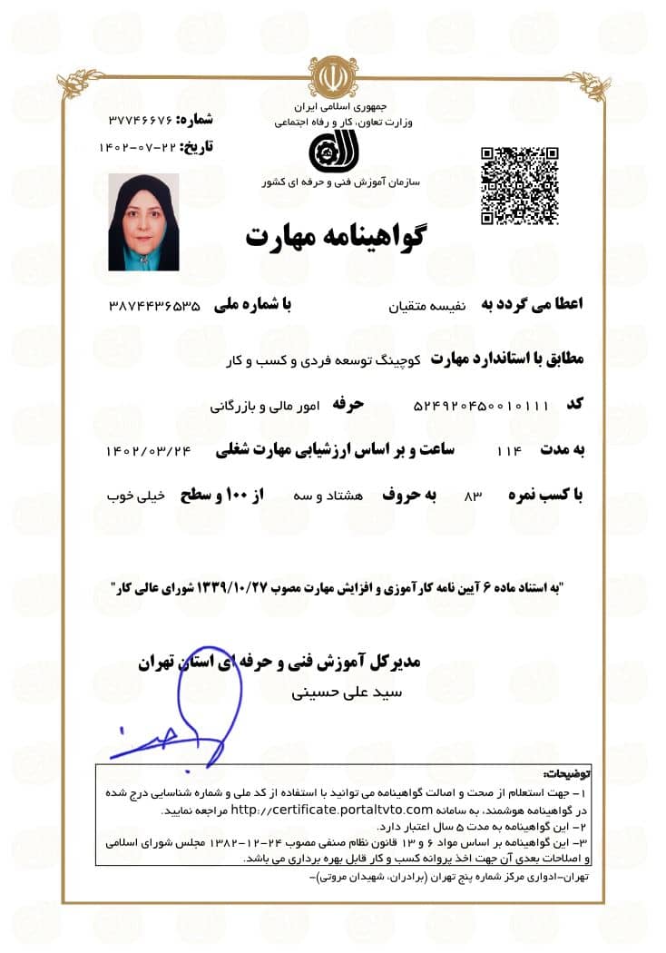 نفیسه متقیان هستم با بیش از ۳۰ سال سابقه کار در صنعت. از سال ۱۳۹۶ وارد صنعت مشاوره کسب و کار شدم. از سال ۱۴۰۱ وارد حوزه کاری کوچینگ شدم. هم اکنون یک بیزینس کوچ هستم. خوشحال میشم به کسب و کارها کمک کنم تا رشد بیشتری داشته باشند