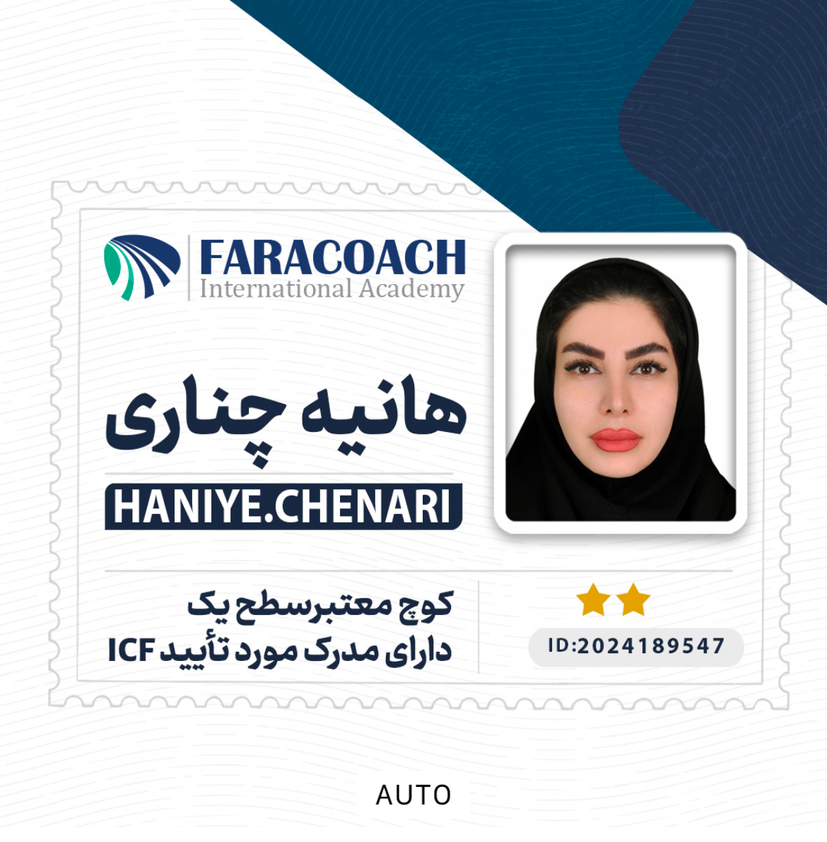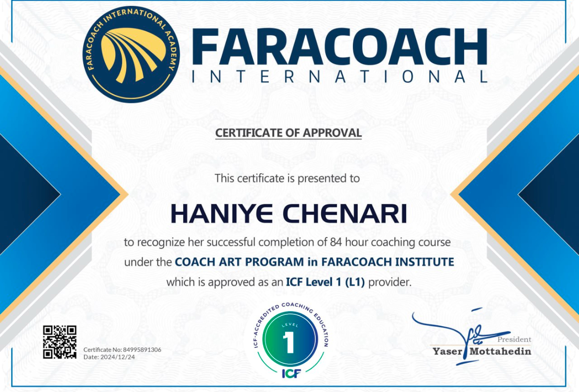 کوچ معتبر سطح یک  دارای مدرک مورد تایید icf  دارای مدرک فنی حرفه ای کوچینگ توسعه فردی و کسب و کار  دانشپذیر سطح دو کوچینگ‌ سفیر رسمی اکادمی بین‌المللی فراکوچ