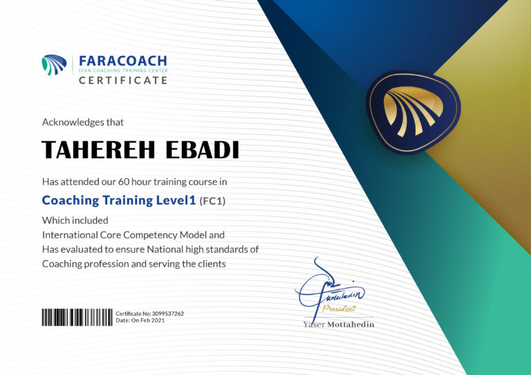 کوچ معتبر سطح دو دارای مدرک مورد تایید icf لیسانس روانشناسی عمومی دوره های ارتباط بدون خشونت (nvc) تحلیل رفتار متقابل (TA) دوره ی بین المللی مقدماتی و تکمیلی مربی گری فلسفه ی کودک 250 ساعت دوره ی “پویایی خانواده ”